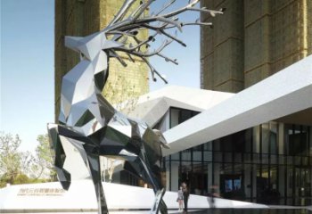 城市中的大型不锈钢几何梅花鹿雕塑