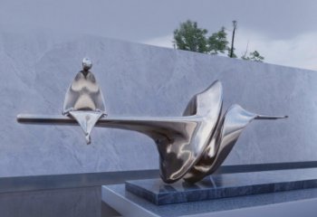 这是一件铜雕艺术景观雕塑,以倾斜的类似水波造型为底座,上面是一艘载有一人的小船。通过简洁的造型,营造出静谧、悠远的意境,展现出独特的艺术美感与哲学思考。