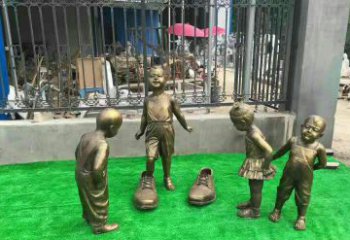 青铜创意穿虎头鞋儿童雕塑是一款高雅的艺术品,它是由一对可爱的虎头鞋和一个儿童雕像组成,整体精致大方,充满童真的气息。